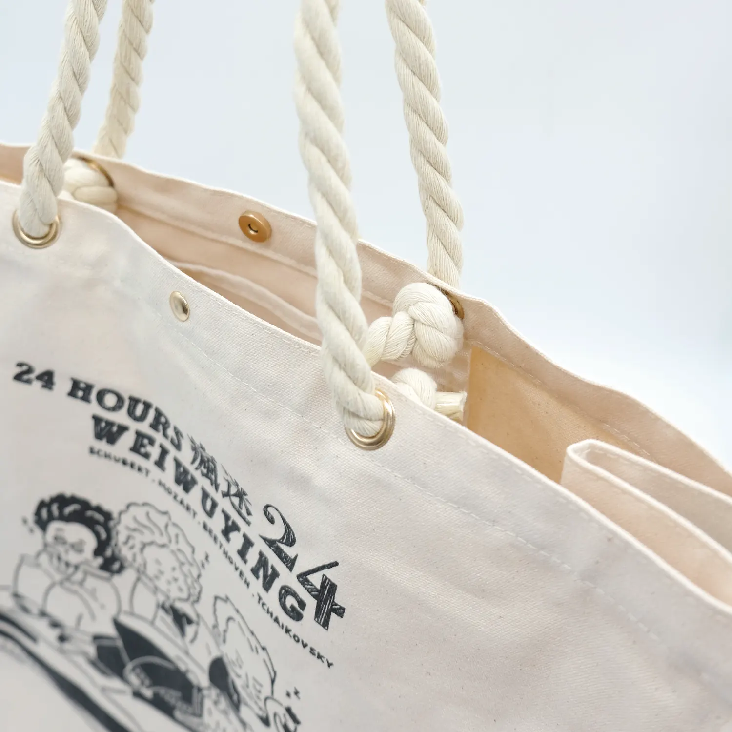 其他:手提麻繩+雞眼扣,袋口加磁扣,側邊加織標